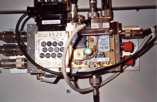 12-Port GaAs-FET Antennenschalter (DG7RCR & DK8PN) zur "umlaufenden Antennensteuerung" mit Fernspeisung für die abgesetzten HF-Köpfe der zur Zeit 10 Antennen (1 Drahtgitter-Parabol 1.2m, 8 Parabole 0.7m und ein 8dB-Rundstrahler). Der GaAs-FET-Schalter schaltet die Antennen kontinuierlich im Kreis herum durch und hält automatisch an, wenn ein Signal mit Bild-Synchronimpuls ausgewertet wird. Wird das Video-Signal wieder vom Relais heruntergenommen, beginnt der automatische Antennenumlauf erneut mit der Signalsuche. Auf diese Weise wird ein "Rundstrahl-Effekt" mit sehr hohen Antennengewinnen (20dB) realisiert.