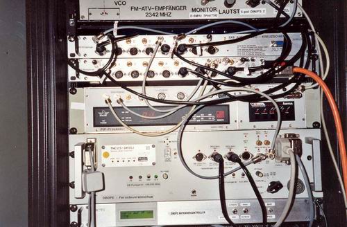 Obere Schrankhälfte, von oben Bildmustergenerator, 40 Watt-Endstufe, FM-TX 1278 MHz, FM-RX 2342 MHz, 8x8 Video-Kreuzschiene, PIP-Prozessor und HAMA-Trilock, 70cm-Doppel-Funkgerät 431.950/439.550 MHz, SPS-Relaissteuerung.